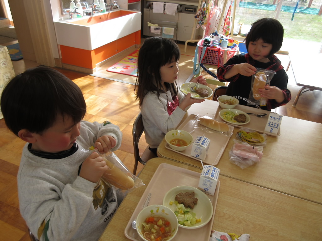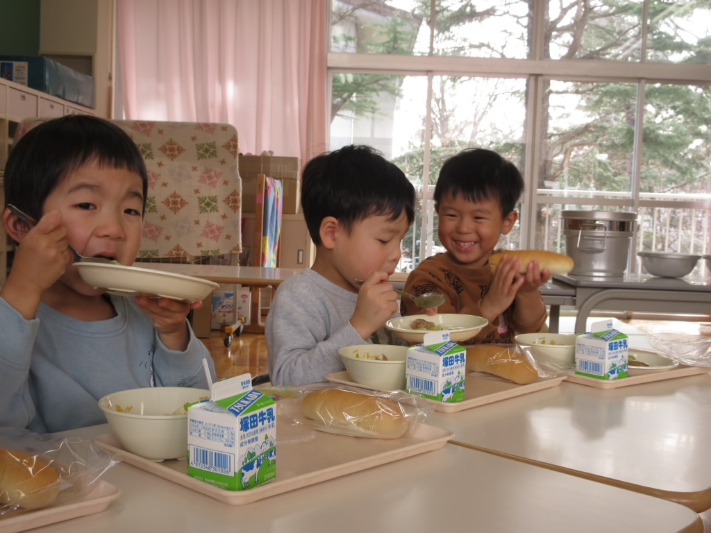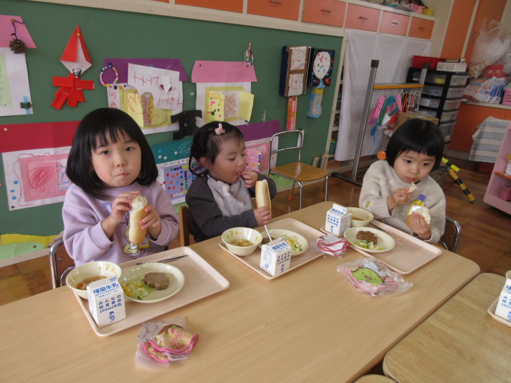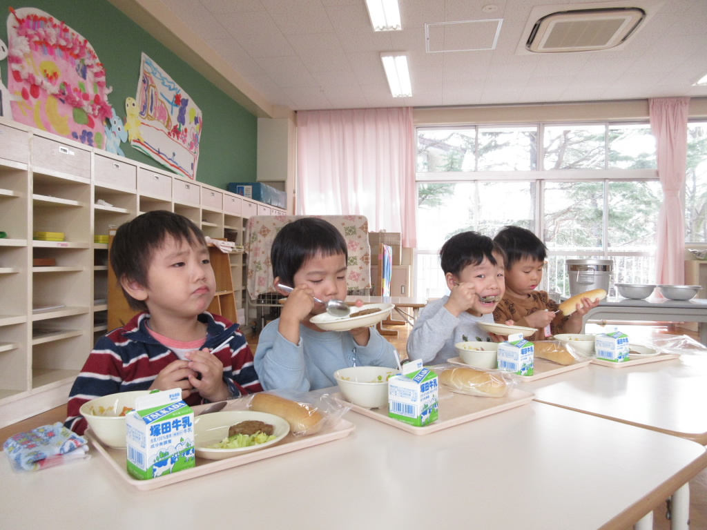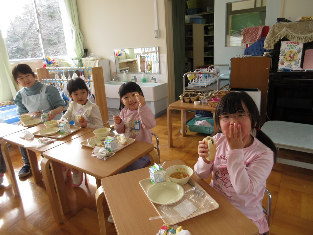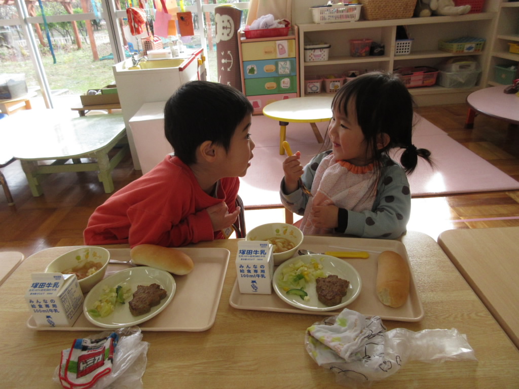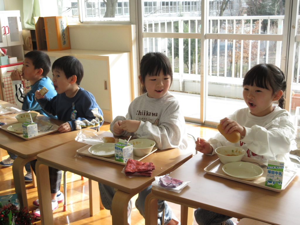 今日は、給食最終日です。もみの木ハンバーグにミネストローネ、クリスマスデザート・・・と子どもたちが大好きなメニューが勢ぞろいでした。パンにハンバーグを挟んで食べる子、サラダに入っている星型のチーズを見つけて大事そうに食べる子など、食べ方はいろいろです。最後はのクリスマスデザートには、調理員さんがクリスマスカラーのリボンを掛けてくださいました。