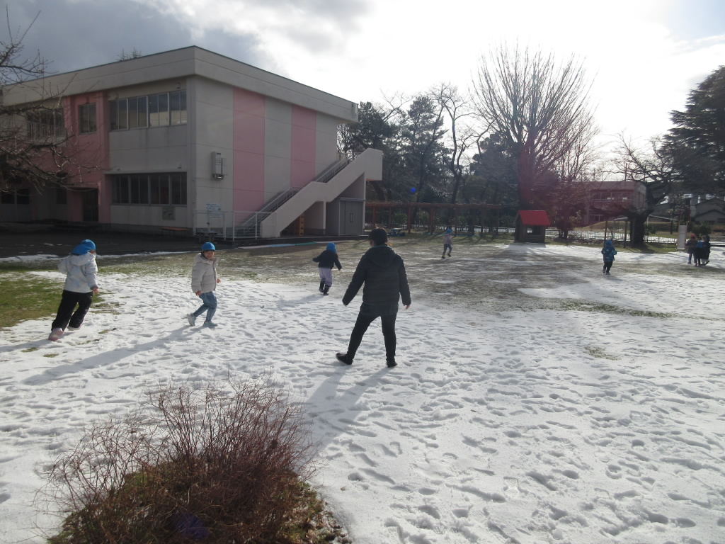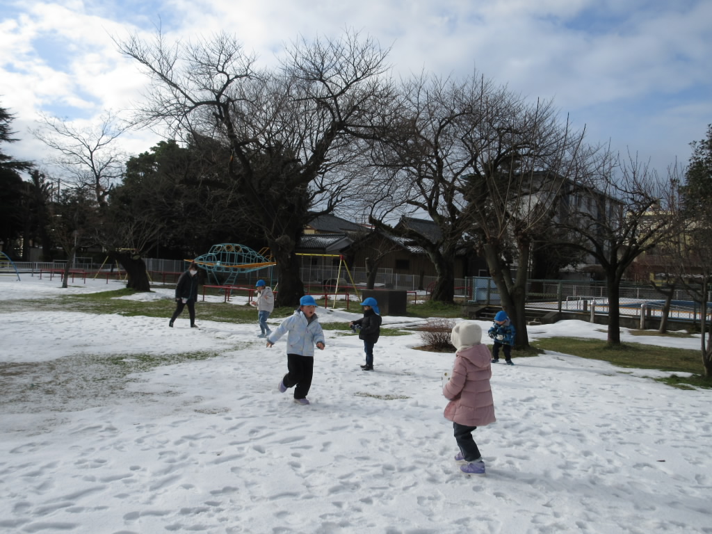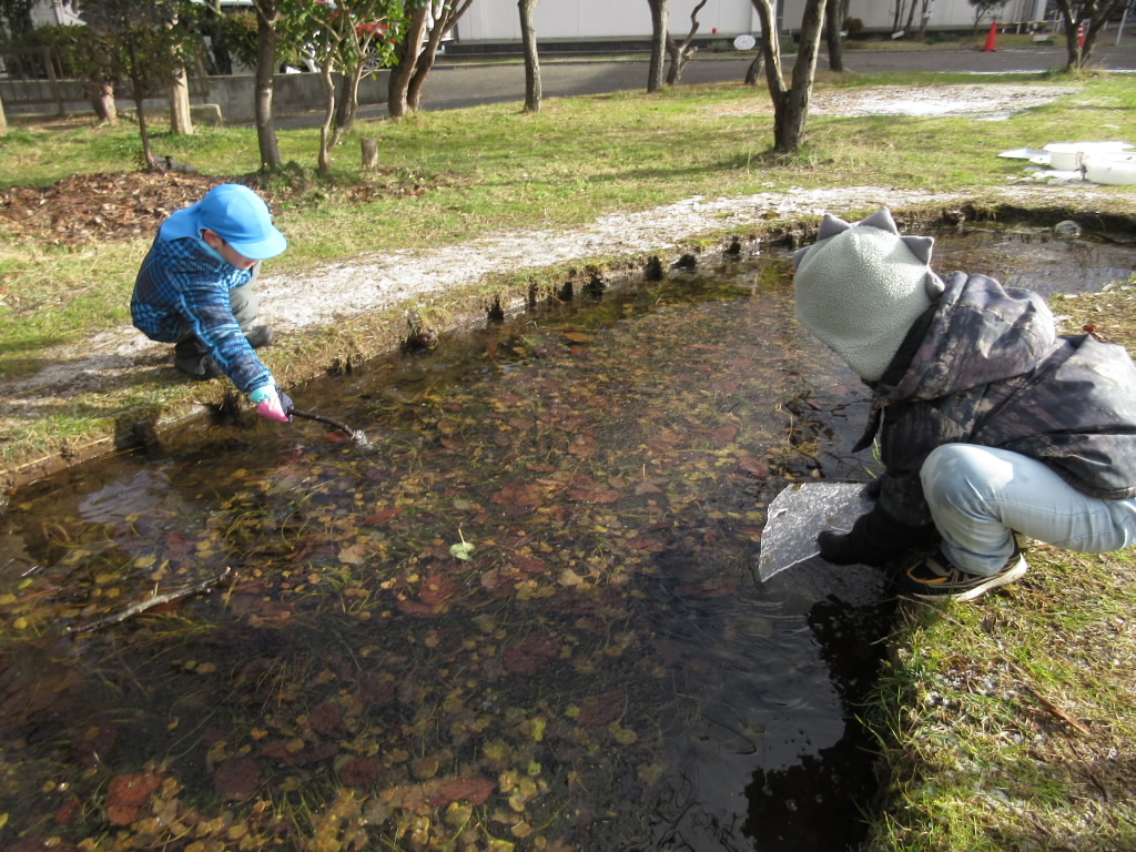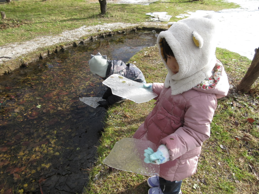 園庭のきらきら池に氷が張りました。子どもたちは、感動とともに早速手に取り、集めたり触ったり、形を眺めたりして遊び始めました。寒い季節ならではの自然現象の不思議さを肌で感じていました。