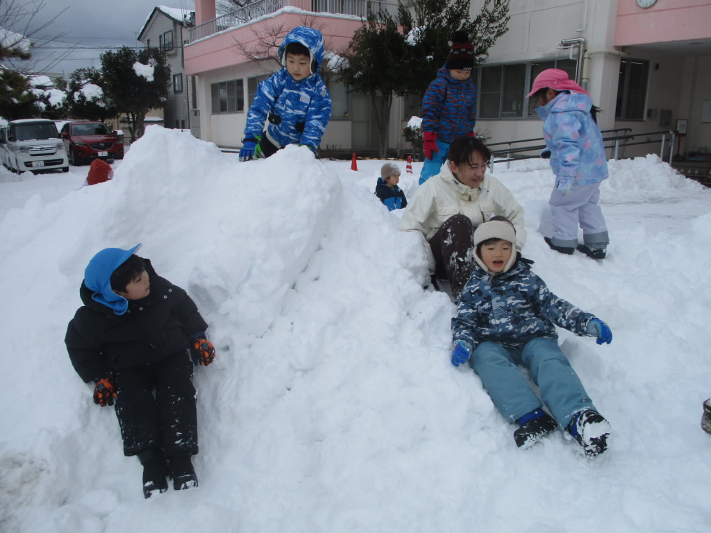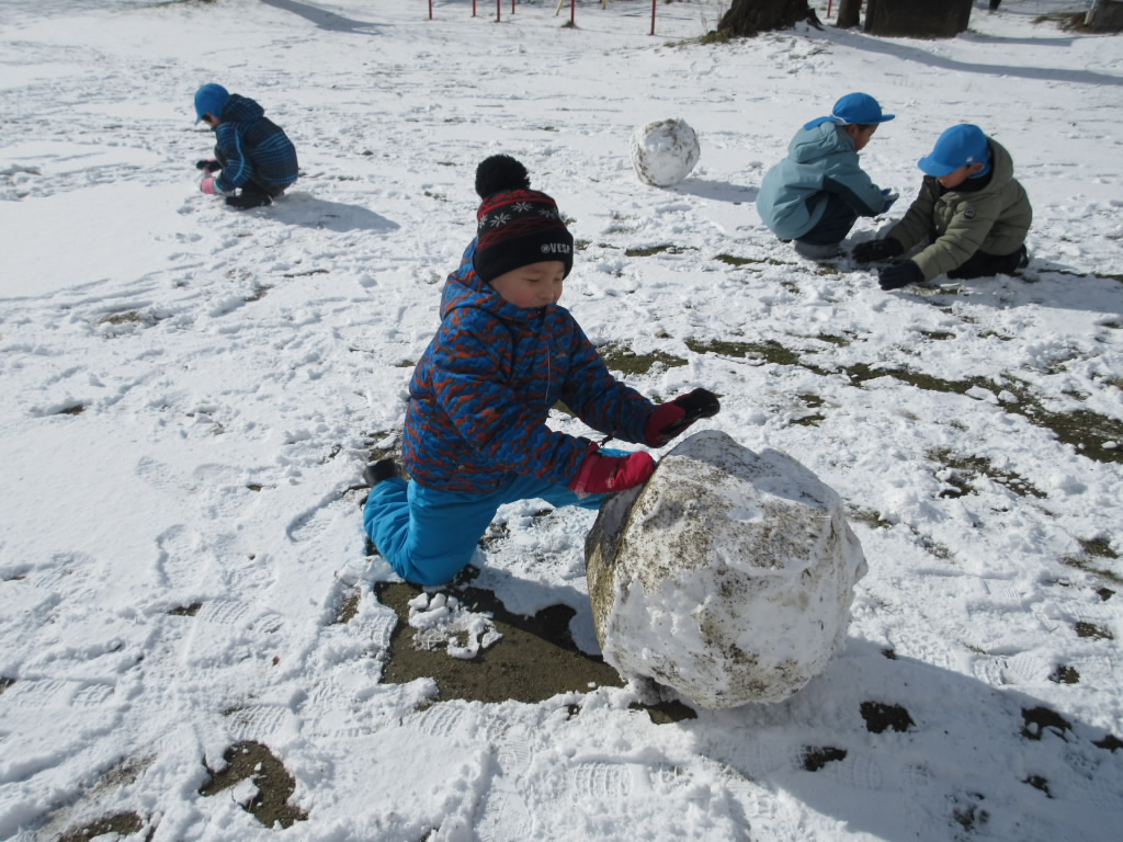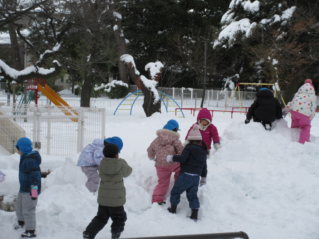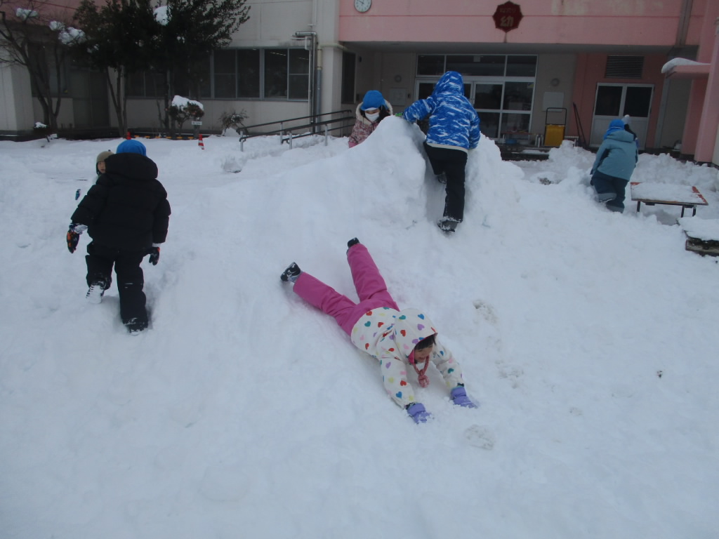 辺り一面銀世界!幼稚園の園庭に雪が降り積もりました。待ってましたとばかりに、子どもたちは雪遊びを楽しみました。滑って、投げて、転がして、積んで、寝転んで・・・思い思いに遊んでいます。