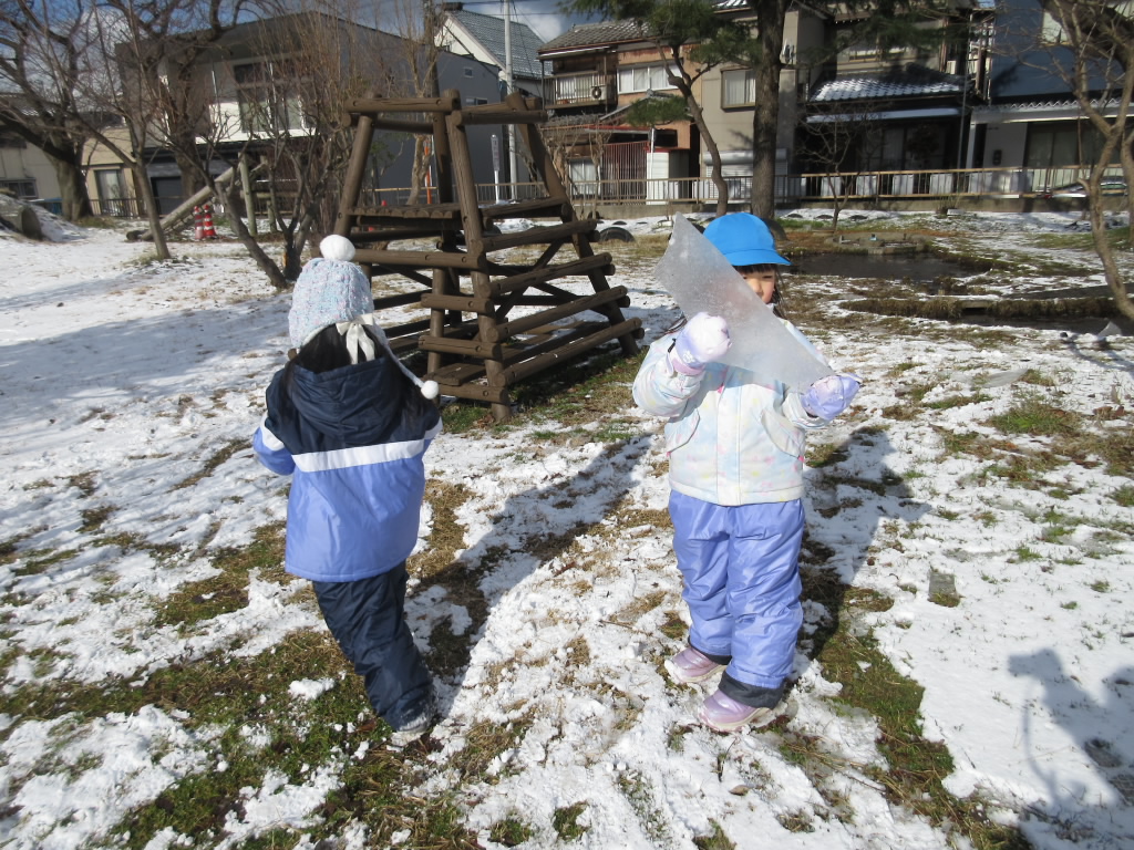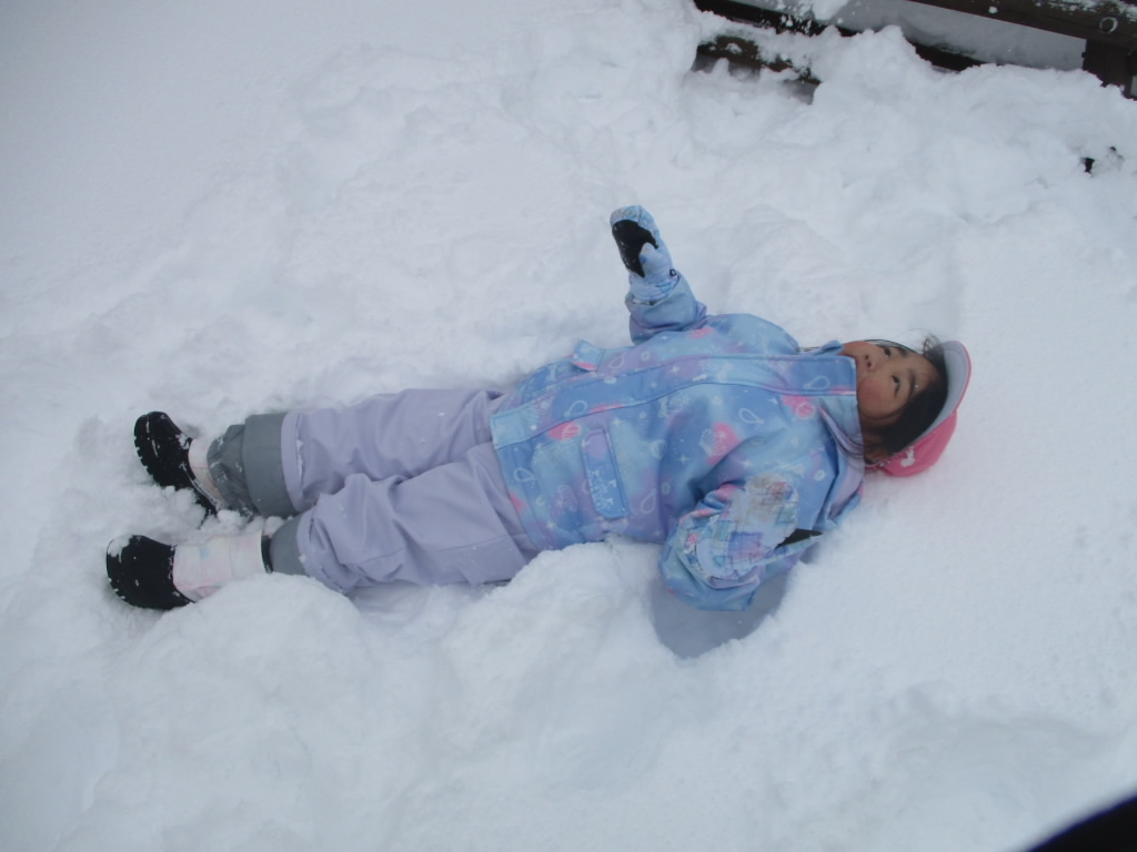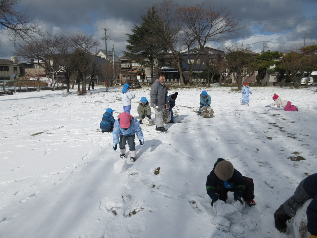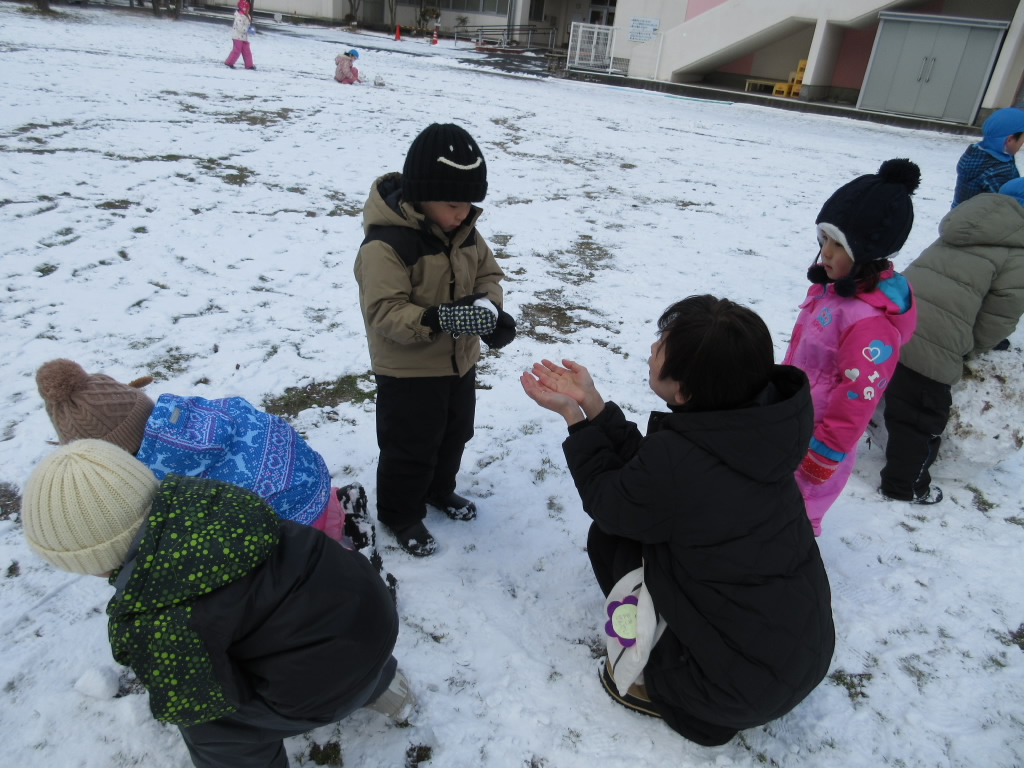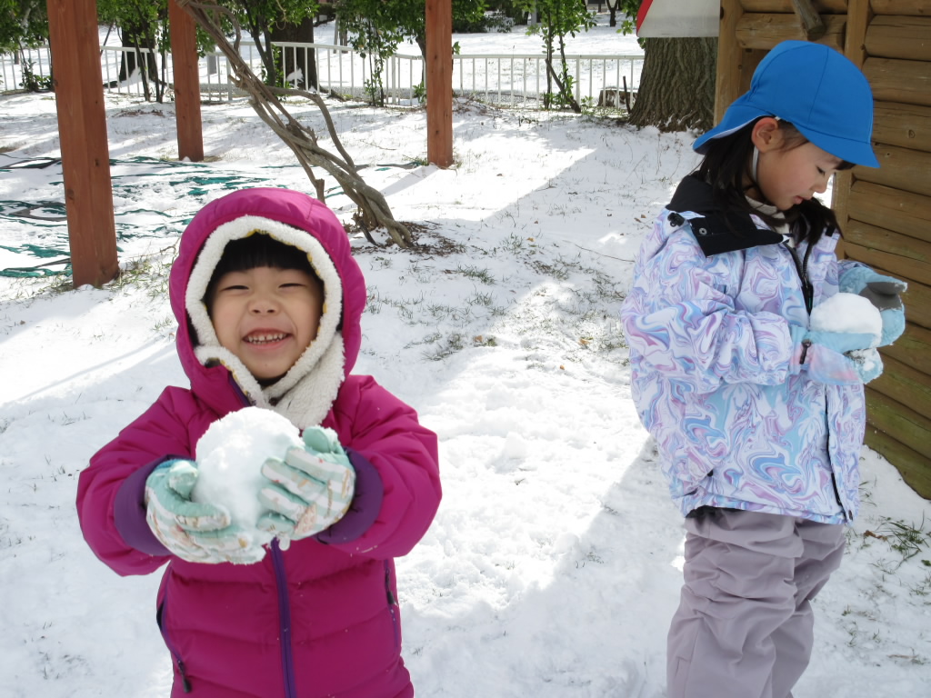 辺り一面銀世界!幼稚園の園庭に雪が降り積もりました。待ってましたとばかりに、子どもたちは雪遊びを楽しみました。滑って、投げて、転がして、積んで、寝転んで・・・思い思いに遊んでいます。