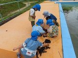 年長組の子どもたちは,ヤゴを手に乗せ,年中組の子どもたちに話しかけます。