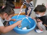 「棒で捕まえたんだよ」とAさん。それを聞いた子どもたちが,たらいの周りに紙を丸めて作った棒を持って集まります。棒の先をはさみにかざして挟ませようとしましたがうまくいきません。今度は,年長組に行き,たこ糸をもらって釣り竿を作りました。