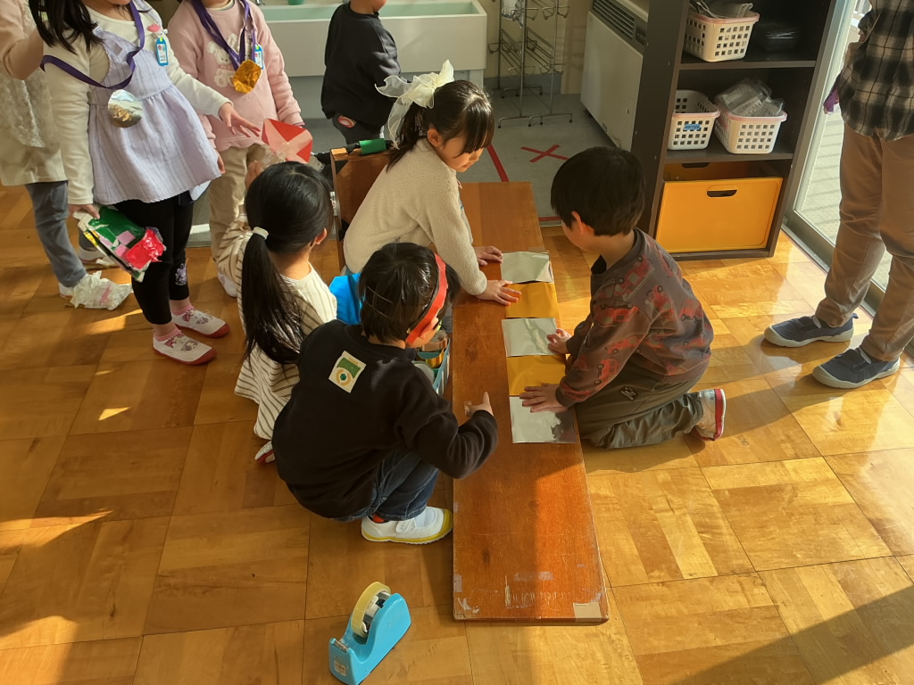 感動のオリンピックは、子どもたちの中でもとても印象的だったようで、毎日のように沼垂オリンピックが開催されました。廃材を使って自分なりにスケート靴を作り滑ってみたり、スノーボードが滑る坂道を試行錯誤して作ったり、学年の育ちに合わせて使う道具や廃材も、イメージもそれぞれです。ただ一つ、オリンピックを楽しむ姿は共通でした!