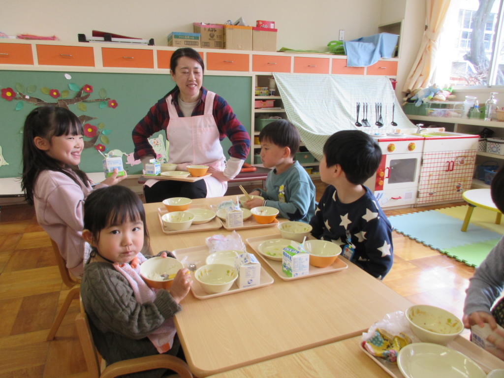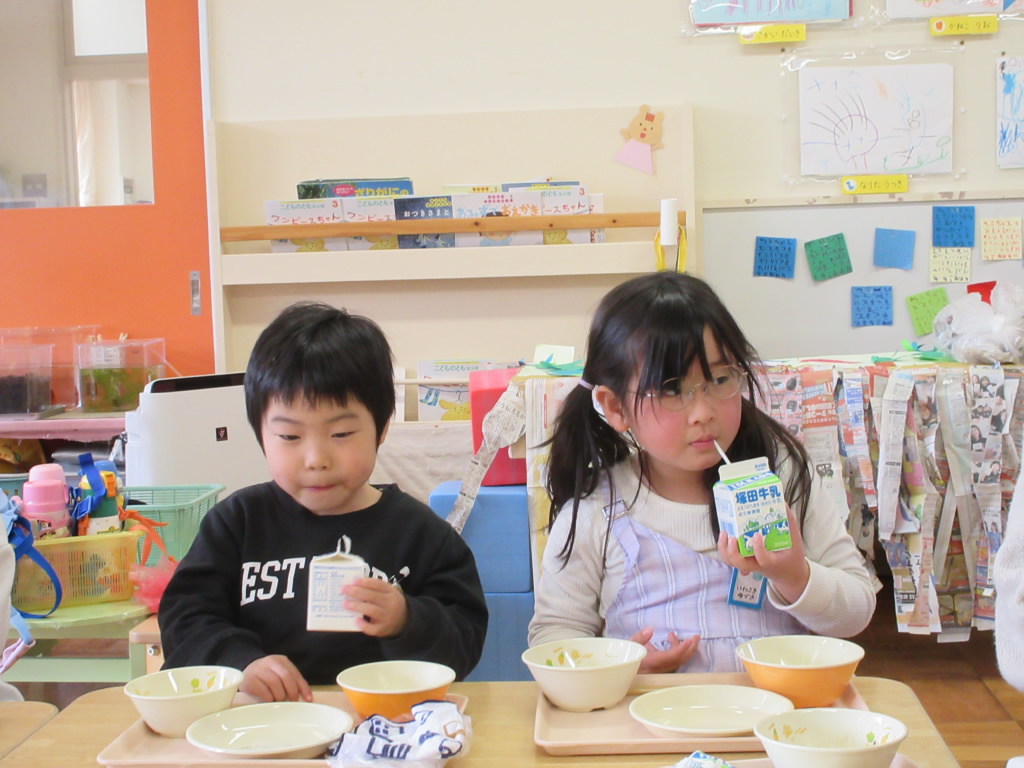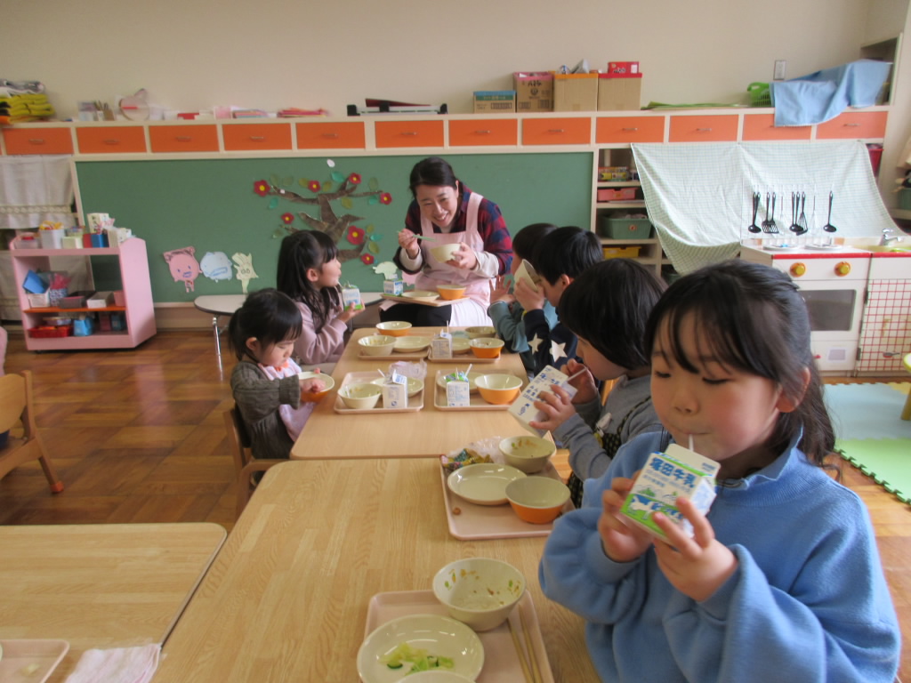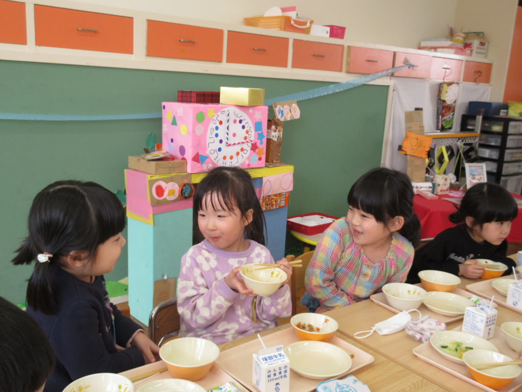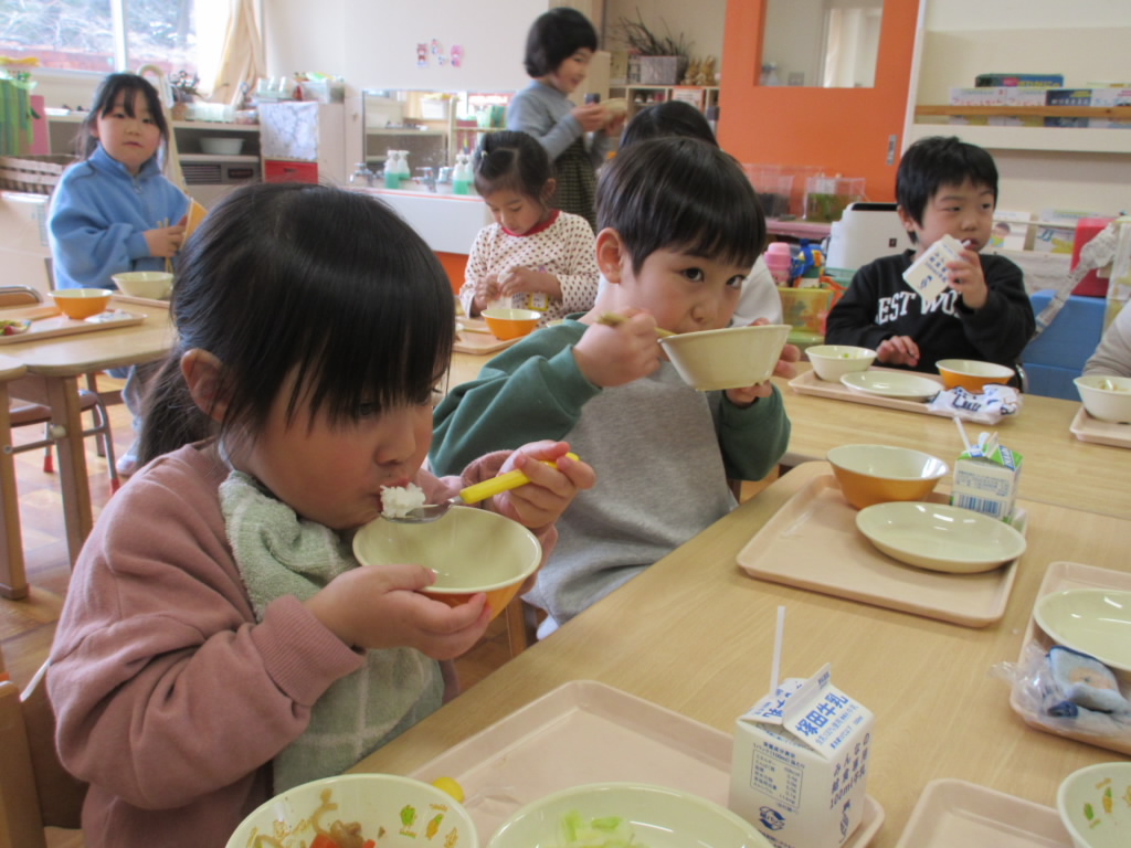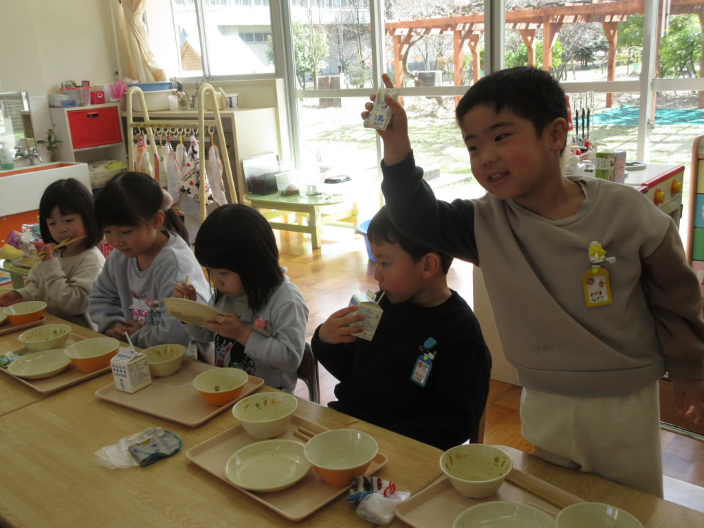 来週、修了式を迎える年長さんです。今まで一緒に遊んだり、笑ったり、共に過ごした思い出は数え切れません。年少さんと年中さんは、「今までありがとう!」の気持ちを込めて、年長さんと一緒に給食を食べています。自分たちの保育室に、年長さんが来てくれることがとてもうれしい様子です。いつも以上に、張り切って給食を食べる子どもたちです。