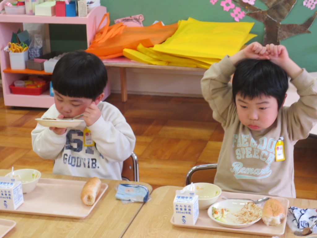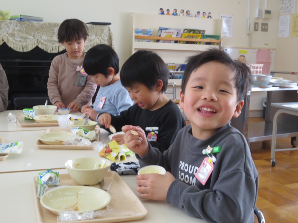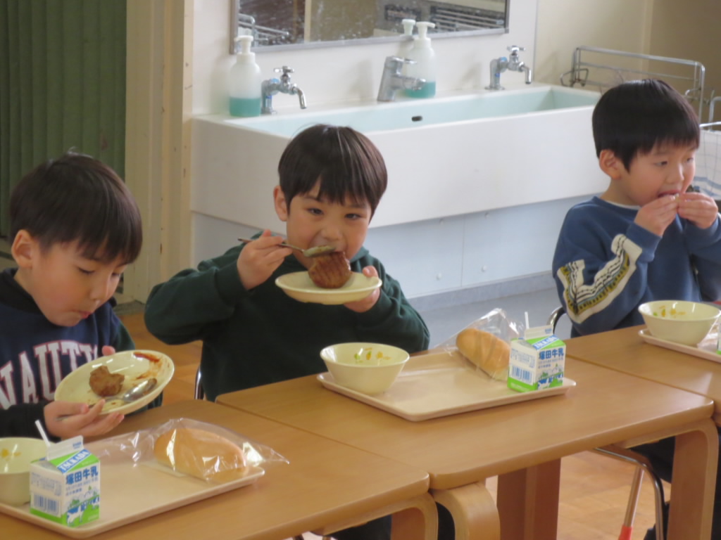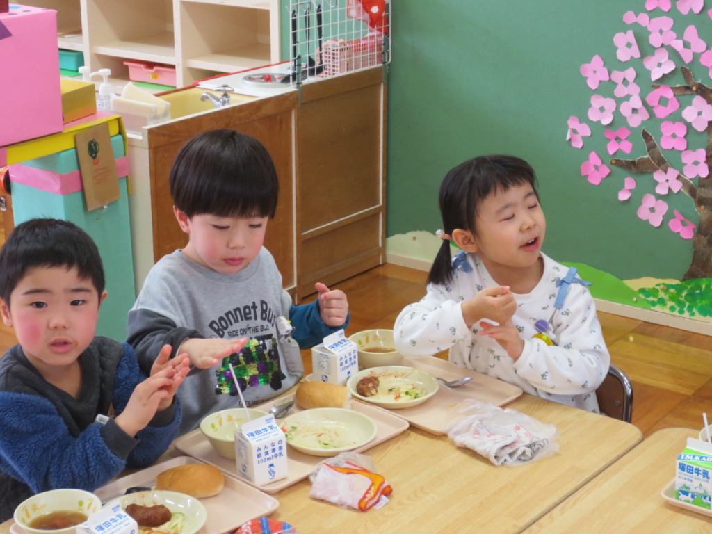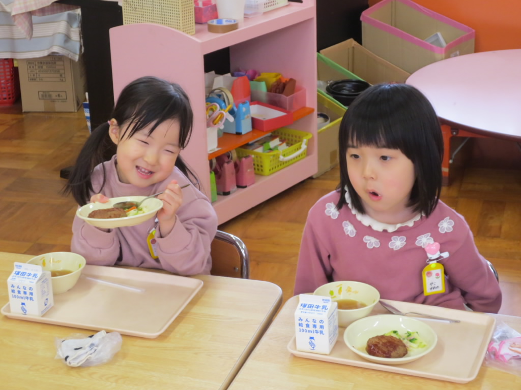 一年間、毎日ほかほかのおいしい給食をいただくことができました。沼垂幼稚園の子どもたちと職員は、給食が大好きです。子どもたちが「食べたい!」と思えるようにたくさんの工夫がされた給食です。味はもちろんのこと、切り方、彩り、盛り付け方、すべてが考えられています。おいしくて栄養満点の給食のおかげで、幼稚園でも元気いっぱい過ごすことができました。
