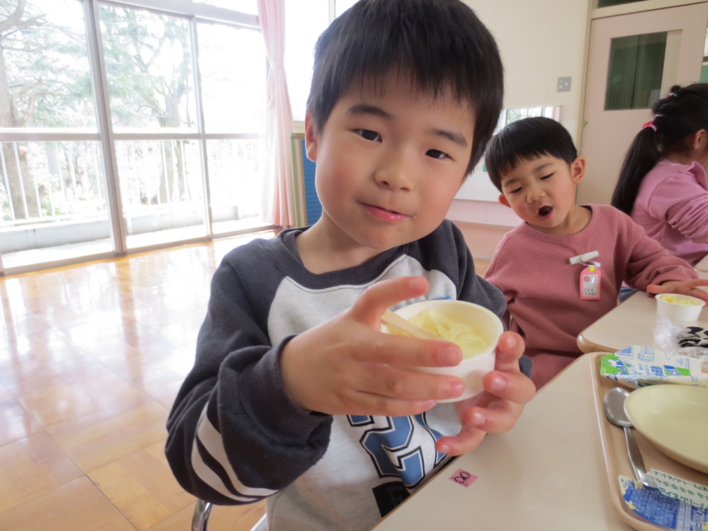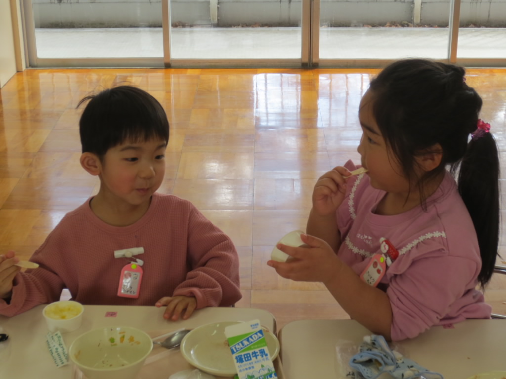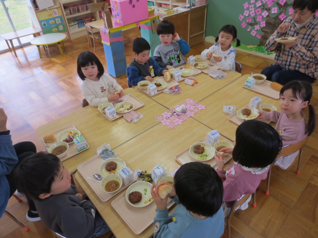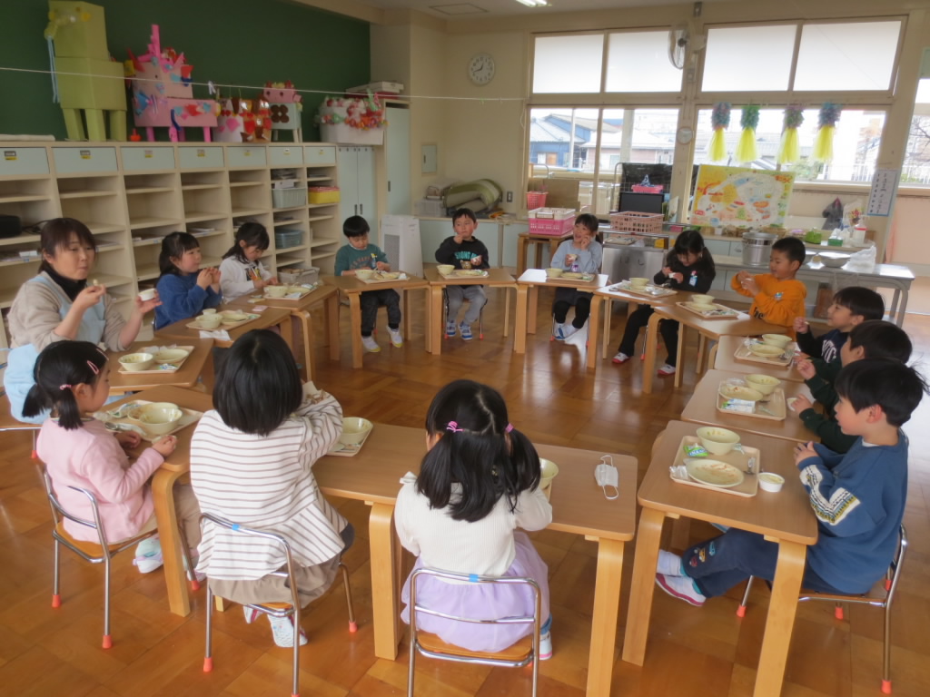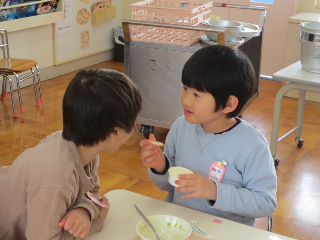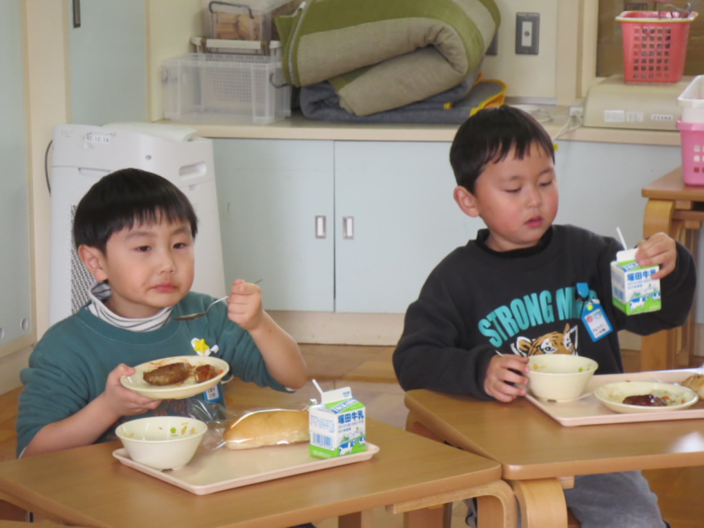 一年間、毎日ほかほかのおいしい給食をいただくことができました。沼垂幼稚園の子どもたちと職員は、給食が大好きです。子どもたちが「食べたい!」と思えるようにたくさんの工夫がされた給食です。味はもちろんのこと、切り方、彩り、盛り付け方、すべてが考えられています。おいしくて栄養満点の給食のおかげで、幼稚園でも元気いっぱい過ごすことができました。