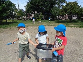 こちらでは虫探しの真っ最中のようです。園庭には秋の虫が顔を出し始めています。