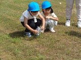 農村公園に到着すると,子どもたちはどんぐりやイナゴ,バッタを夢中になって探します。跳んで逃げるイナゴにそっと近づいて捕まえようとしていました。