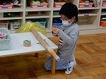 年長組のレース「ハロウィンの世界に出発だ!」では,園長先生に「〇」印を出していただく場面があります。今日は一緒に練習しました。競技で使う道具作りも子どもたちが頑張っています。