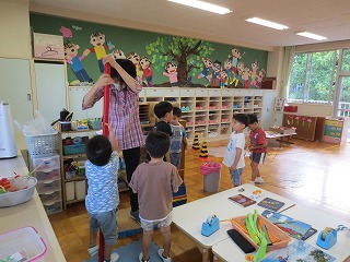 すぐ近くでは,先生に棒を支えてもらい,10数える間,つかまろうとしている子どももいます。