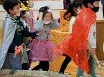 「生活発表会でやった『もりのおくのおはなし』を一緒にやろう。劇ごっこしよう!!」と,年長組が年中組を誘いに来ました。「うれしいっ。一緒にできるの?」「おうじやりたい」「ようせいになりたい」「だいまおうがいいなあ」年中組は張り切っています。年長組は,衣装のしたくや台詞,動きなどを教えてくれます。