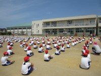 今日、3時間目に大運動会の予行練習をしました。今日は並び方の確認と開・閉会式の練習を行いました。メインは応援合戦とエール交換です。今まで応援団のリードの下、各教室や各組に分かれて行ってきた応援練習ですが、今日は全校の子ども達が一堂に会して行いました。どちらの組もとても気持ちの込もった応援で、運動会当日への気持ちもさらに高まったようです。