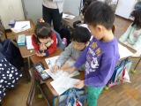 1の1では,算数のたし算カードでゲームをしていました。先生が告げた「足し算の答え」になる式のカードを取り合っていました。頭に手を置いて友達よりも早くカードを取ろうと用意しているかわいい姿が見られました。