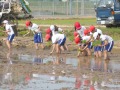 めて田んぼに素足を入れた子どもがほとんどで,始めは「キャー!キャー!」叫びながらの田植えでした。慣れてくると,泥から足を引き抜