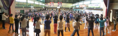 テージの上や前,体育館脇に位置して盛り上げました。体育館いっぱいににこにこした笑顔があふれました。