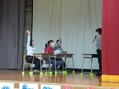 休憩の後,5年生から,6年間の学校生活を描いた寸劇の披露がありました。楽しく算数の勉強をした一年生の授業風景,初めてのリコーダーに友達助け合って挑戦した様子,修学旅行でトキを見たことなど,ユーモアを込めて楽しく表現しました。そこには,ブルゾンちえみさんが登場したり,サンシャイン池崎さんや米倉涼子さんまで出てきて,1年生から6年生まで大喜びでした。