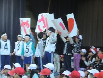 4年生が心を込めて作った「くす玉」を割るセレモニーです。割れるまで皆がどきどきしながら見守りましたが,無事,きれいに割ることができ,大きな拍手がわき起こりました。