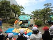 次に,ゴミ収集車を実際に動かしていただきながら,ゴミの収集の仕方について教えてくださいました。係の方の見事な手さばきに驚いたり,安全に効率よく収集するためにさまざまな工夫がなされていることに感心したりと,子どもたちの興味・関心は大きく高まりました。