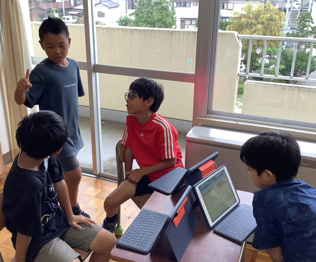 総合的な学習の時間で、身の回りの環境について学習しています。この日は、ネイチャープロジェクト、クリーンプロジェクト、ルールプロジェクト、マスキャラプロジェクトの4つのチームに分かれて、どんなことができそうか、そのためにはどんなことをしなければならないかについて、プロジェクトリーダーを中心に話し合いました。