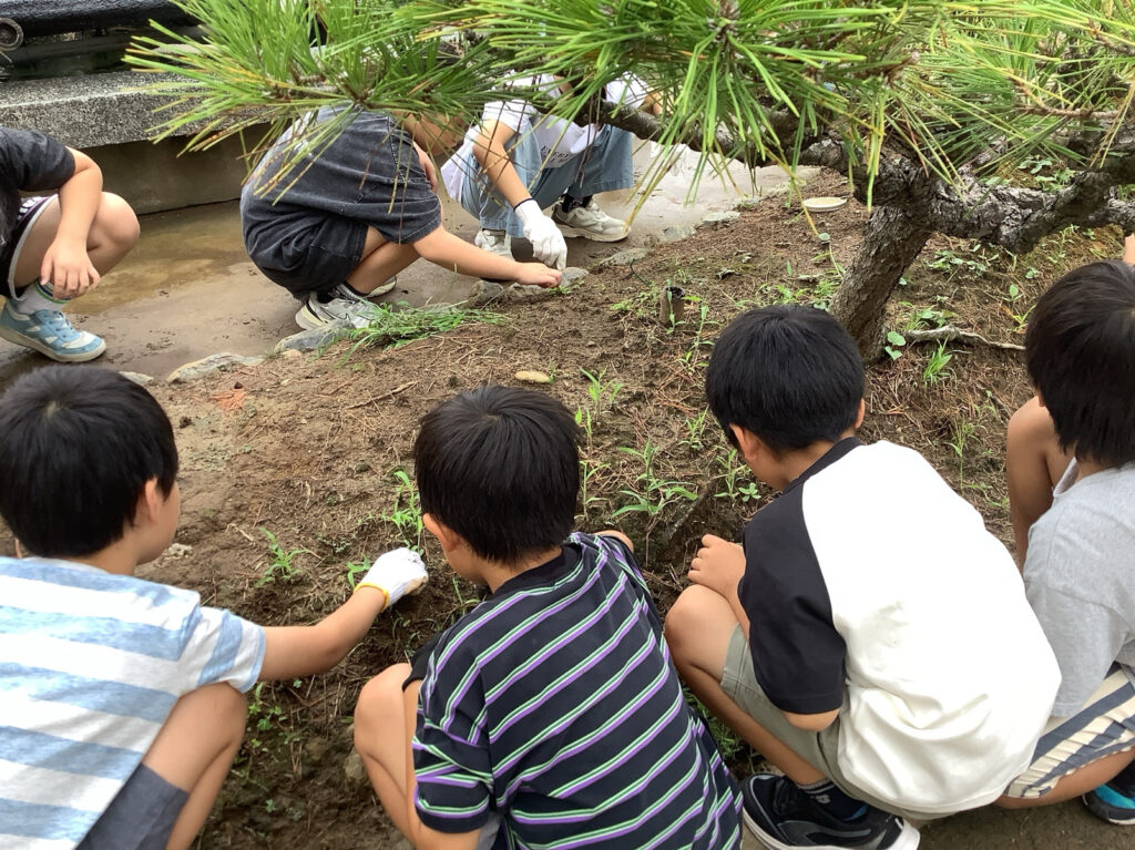 ネイチャープロジェクトは、丸池の周りをきれいにして、花を植えようと計画をし、早速草取り活動をがんばりました。てそして、全校に呼びかけてタブレットを活用してアンケートを取り、芝桜を植えることに決定しました。また、今後、玄関前にも寄せ植えの大きな鉢を置きたいと、計画を立てています。