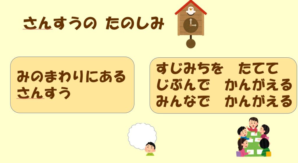 「算数って役に立たない?」との投げかけから、数を数えることはもちろん、身の回りにもたくさんの形(図形)があることなど、生活の中には算数がたくさんかくれているとお話がありました。