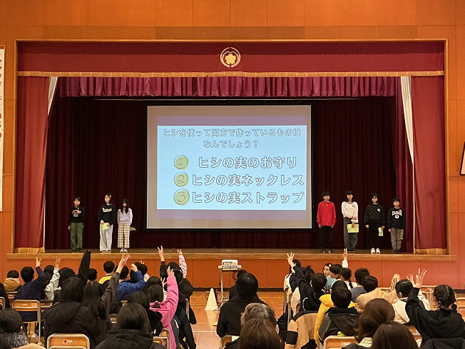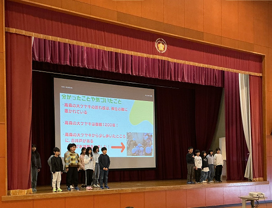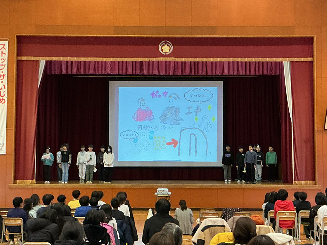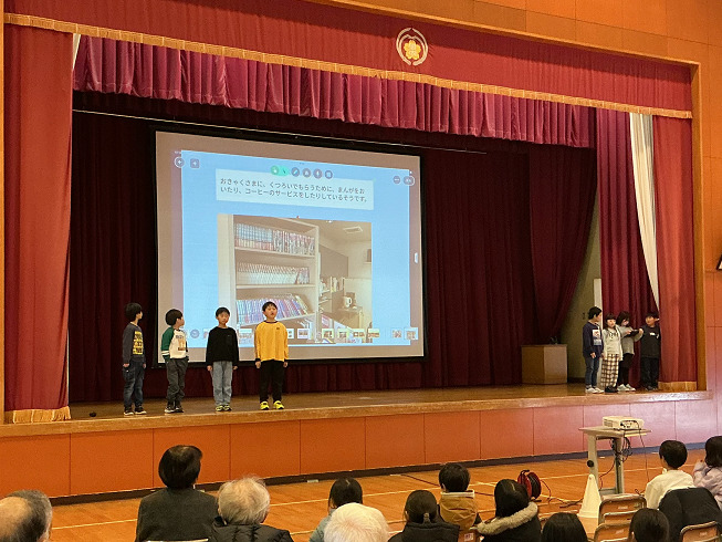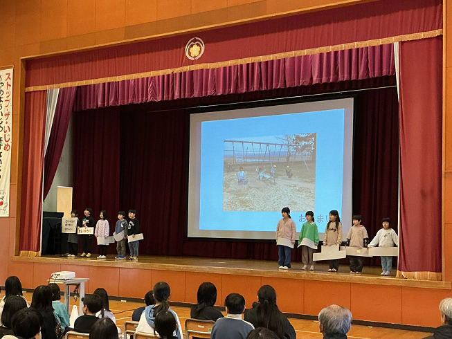 第2部では「岡方すてき報告会」を行いました。保護者や地域の皆さんが見守る中、1年間の学習で発見した岡方の『すてきなところ』を全校児童が堂々と発表しました。