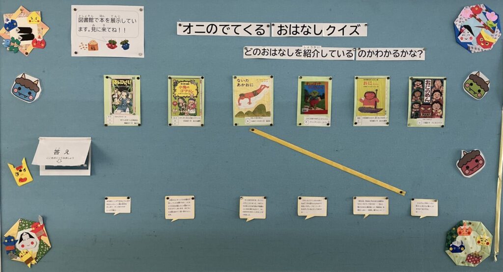 「なまけオニ」「だらだらオニ」をやっつけろ! 「おにのでてくるおはなしクイズ」 このような掲示物、節分の今日は特に目に入ります。 そして、給食メニューには「節分デザート」です。(ふたには6 …