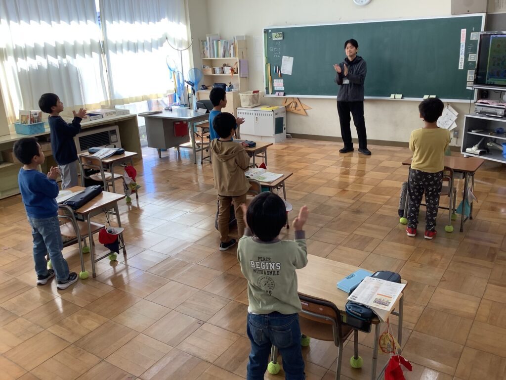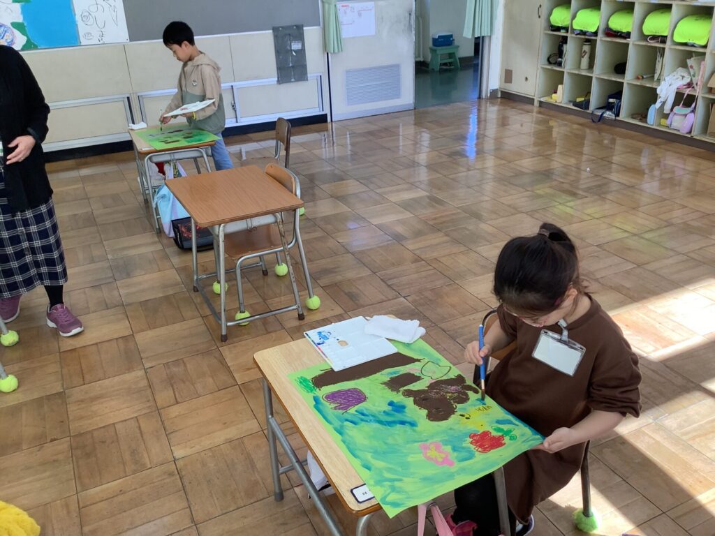 この時、1年生は絵の具を使って作品を作り、2年生は手拍子に合わせて歌っています。