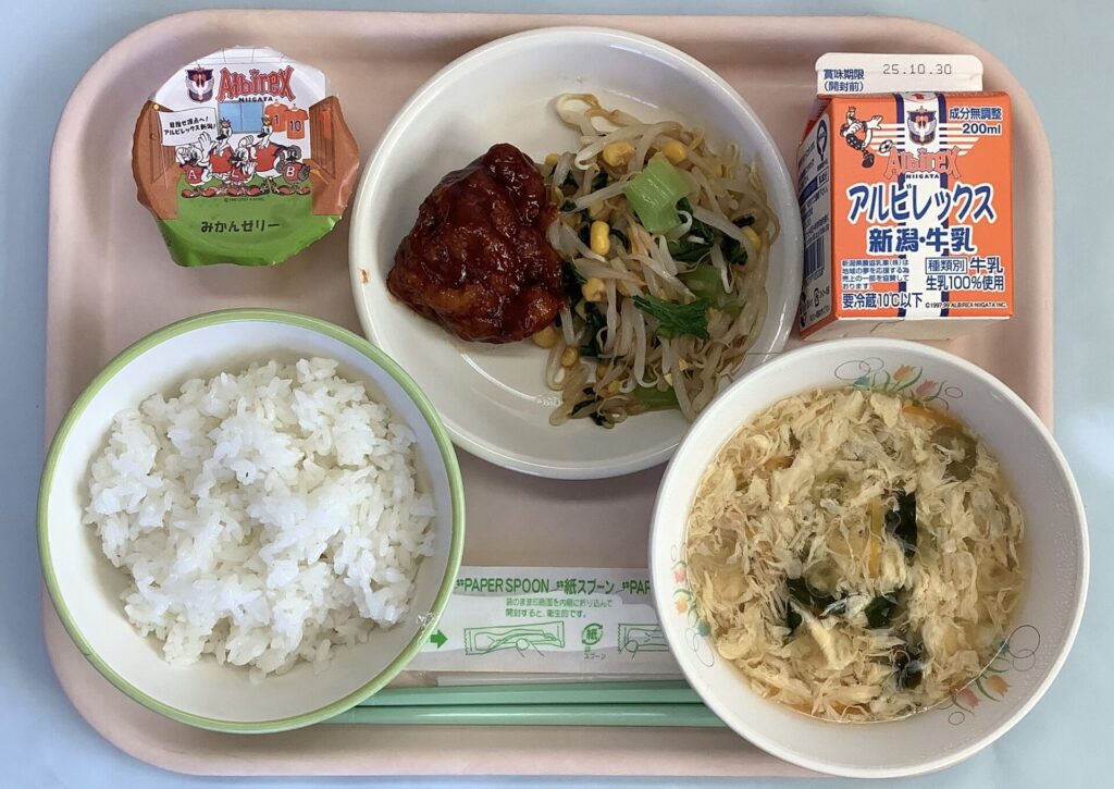 お楽しみの給食時間には「アルビde給食」、アルビレックス新潟トップ選手が食べるメニューでした。
