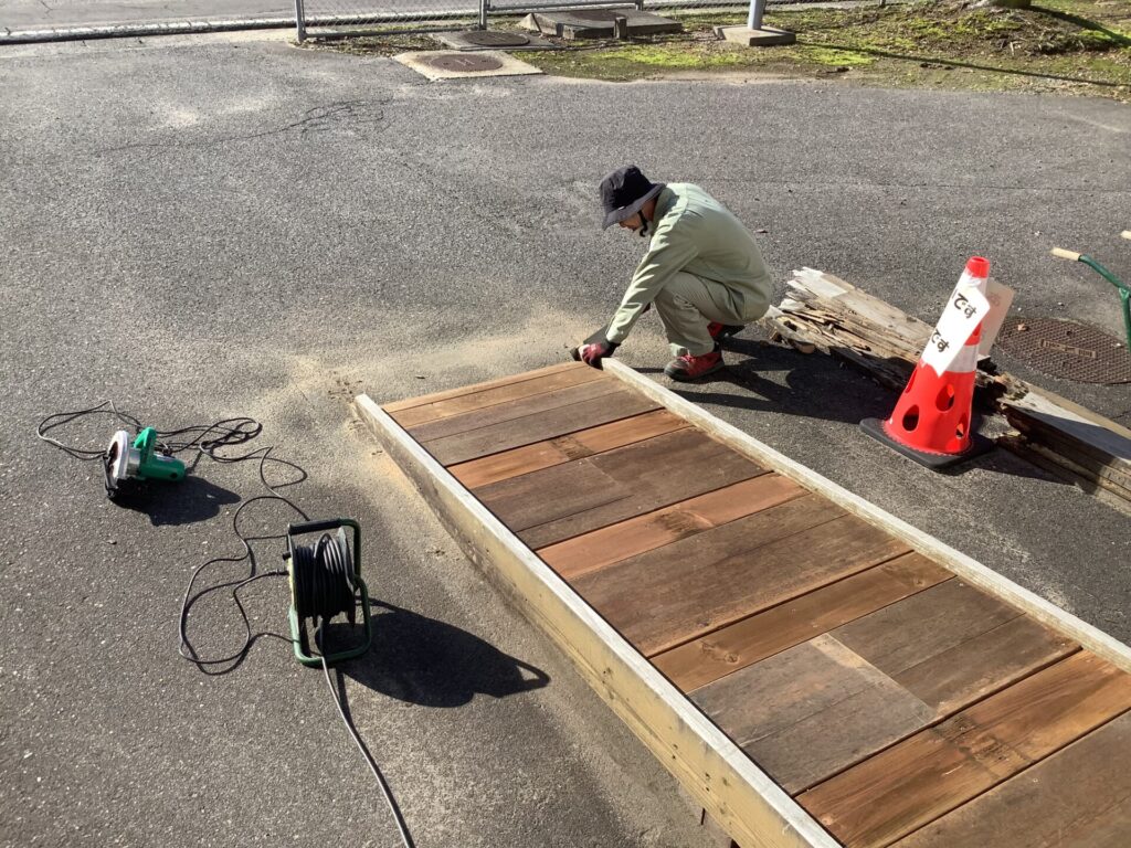 時折の晴れ間を見て、増元用務員は、冬囲いの準備や学校開放用玄関スロープの修繕を屋外で行っています。