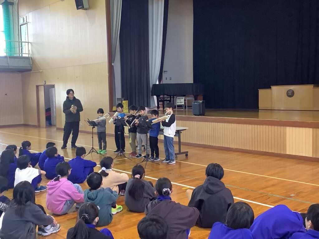 歌と演奏を合わせて6曲の2年生の音楽発表が、午後の体育館に広がりました。