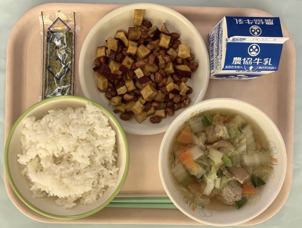 12月スタートの給食メニュー「大豆とさつまいもの揚げ煮」には、けやき2組が育てたさつまいもが入っていました。