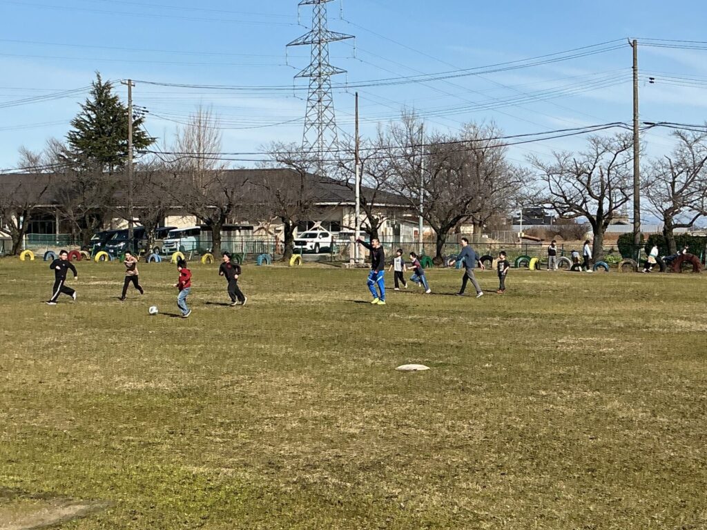 昼休みのグラウンドには、青空に誘われ楽しそうに体を動かす岡方第二小学校の子どもたち。