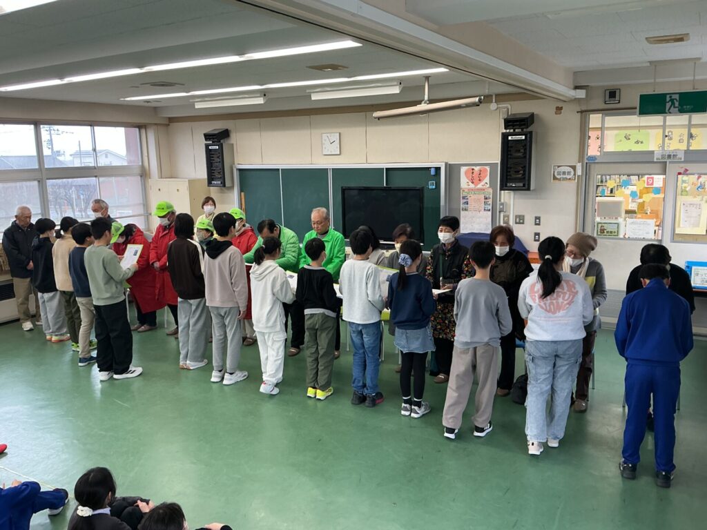 岡二見守り隊と学習支援ボランティアの15名からご出席いただき、2・4年生代表児童が感謝の言葉を伝え、5・6年生が感謝状を渡しました。