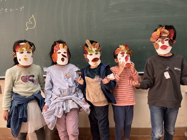 生活科「あきであそぼう」の授業で,ビオトープや校庭周りの落ち葉を集めました。その葉っぱを使ってお面を作りました。子どもたちは「大きい葉っぱを髭にしよう」や,「黄色い葉っぱがたくさん取れたから髪の毛 …
