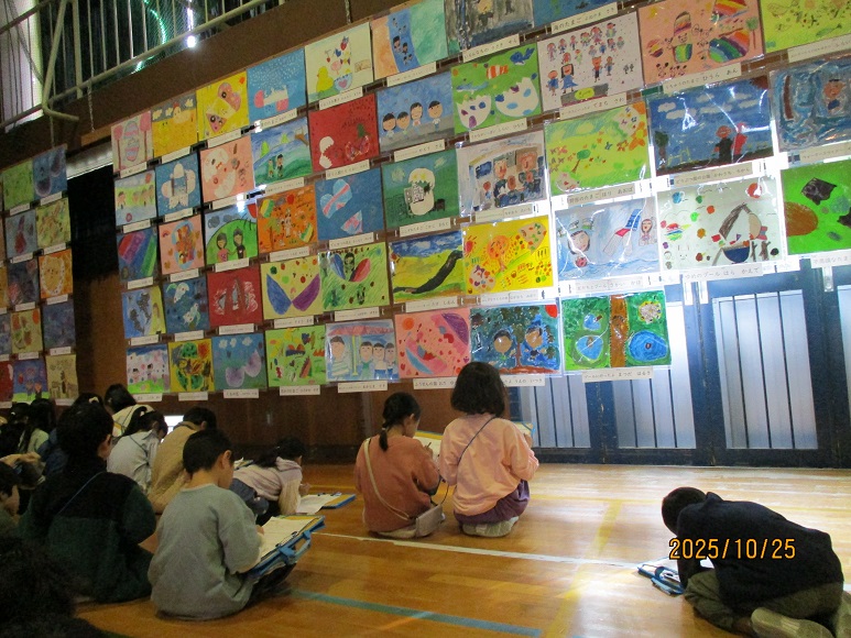 10月25日に坂東絵画展を行いました。 全学年の絵が一斉に飾られて,体育館が華やかになり,この日だけは美術館のようになりました。 「静かに鑑賞すること」「あたたかい気持ちで鑑賞すること」「絵の写真 …