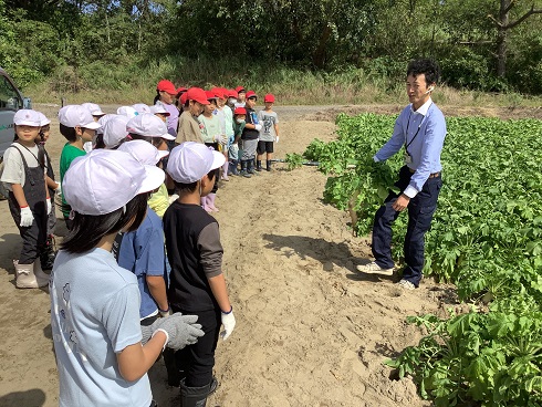 初めに農協の方から,大根の育ち方や種類など,事前に募った子どもたちの質問に答えていただきました。その後畑に移動し,おいしい大根の選び方や,抜き方を教えていただき,自分が抜く1本を真剣に選んで収穫しました。