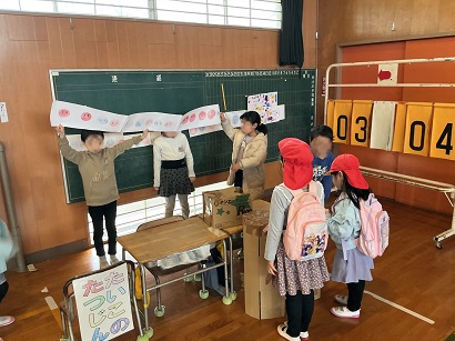 17日(火)2・3時間目に坂井輪幼稚園と坂井保育園の年長さんを招待して,あそびのひろばを行いました。子どもたちは,これまで年長さんが楽しく遊べるお店を目指してたくさん準備をしてきました。当日は,年長さんに優しくルールを説明したり,「すごいね!」と声を掛けたりと優しい姿がたくさんありました。2年生になることが楽しみになる1日になりました。