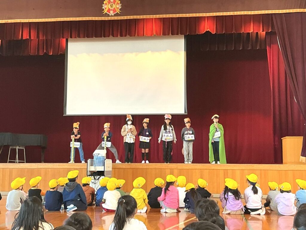始めに紫竹山ヒーローズからの歓迎の言葉あり、それから学年ごとにプレゼントや楽しい学校行事の紹介をしてもらいました。