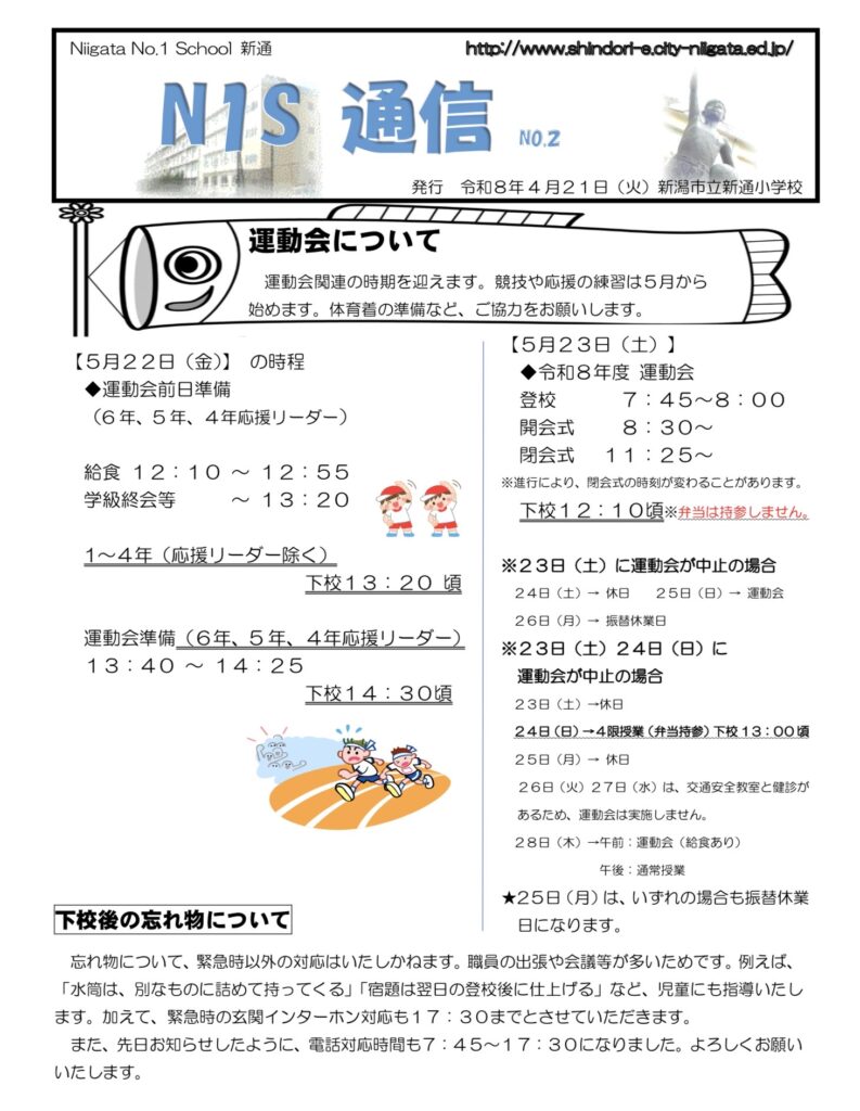 #1年#2年#3年#4年#5年#6年#N1S通信#PTA#いきいき#いじめ防止基本方針#お知らせ#クラブ#その他#にいがた教育通信#ふれあい#ボランティア#わかば#保健#児童会#全校#図書#地域#年間行事予定#広報委員会#教育ビジョン#未分類#活動#研修#給食#行事#配信