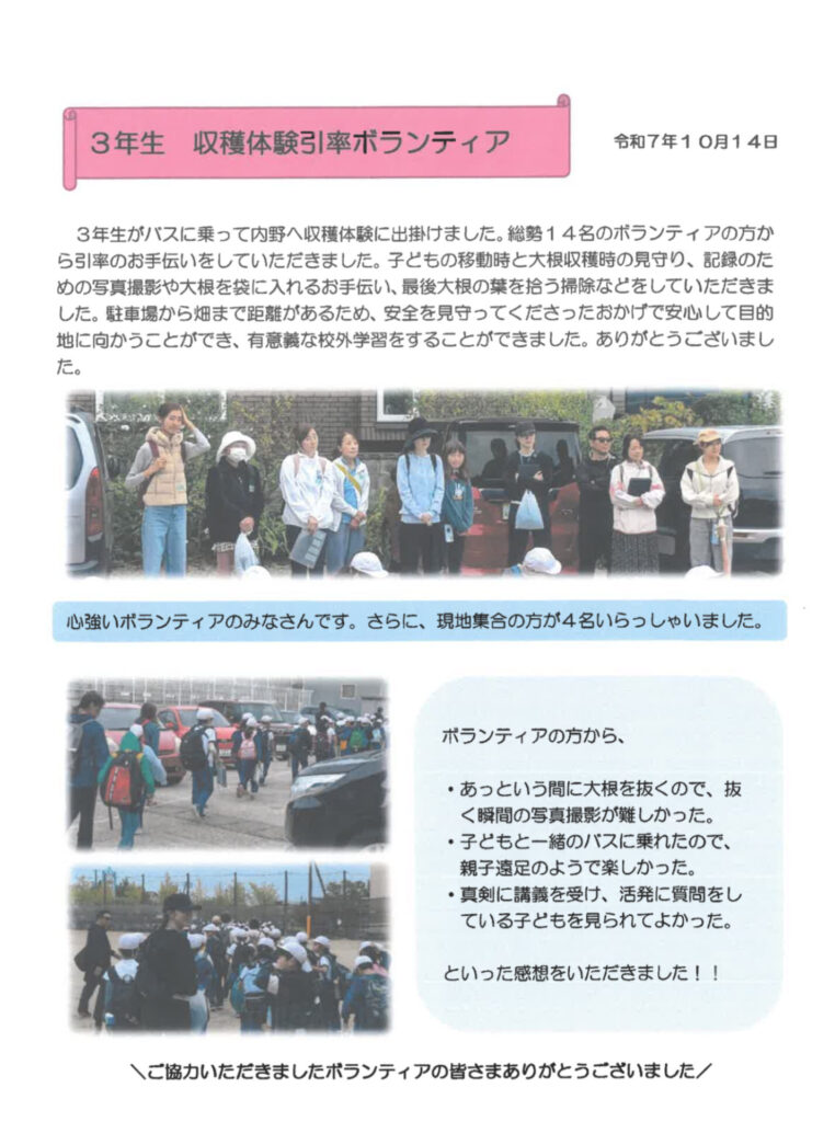 コーディネーターだより(3年生収穫体験引率ボランティア)