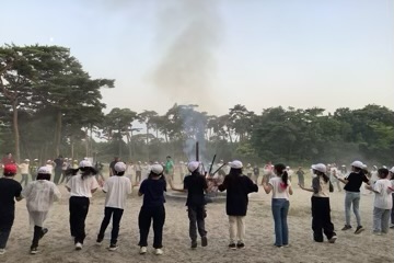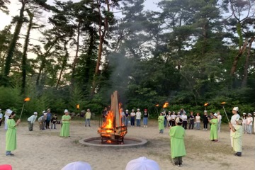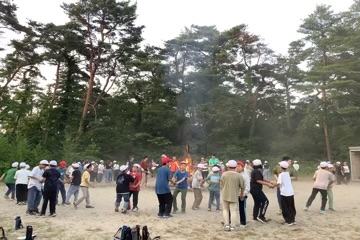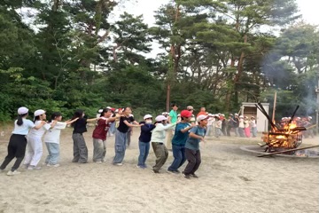 夕焼け空になり始めるころ、キャンプファイヤーが始まりました。火を見つめながら、今日を振り返ったり、楽しくダンスやゲームをしたりして、大いに盛り上がりました。