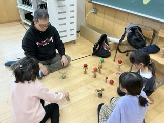 1年生は生活科の学習で、コマやけん玉などの昔からあるあそびを体験しています。23日(金)に「あそぼーれ」の皆様や地域の皆様をゲストティーチャーとしてお招きし、技を教えていただきました。「コマが回せるよ …