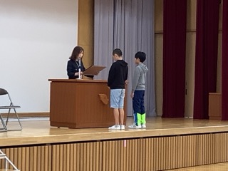 始業式のあとには、いきもの委員会への表彰がありました。モルモットの大福との触れ合い方について、新潟市動物愛護協会からの表彰でした。