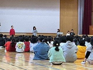 6年生が1年生から送られたペンダントをつけて、花のアーチをくぐって入場すると、下学年からは大きな拍手が送られました。5年生が思い出をスライドにして紹介したり、感謝の言葉を発表したりしました。6年生は、トイ・ストーリーをテーマにした劇と「君はともだち」の演奏を披露してくれました。
