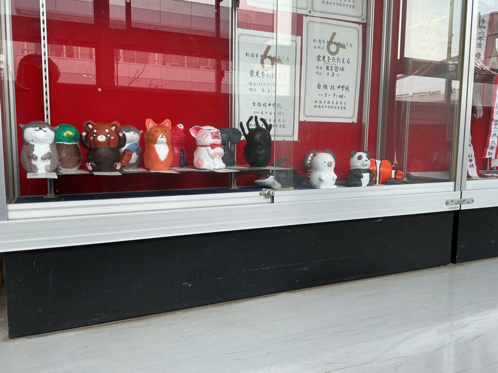 2年生が美術の時間に、紙粘土で貯金箱を作りました。先日から職員室前に展示されています。とても上手にできていたので思わずパチリ。みんなセンスありますね。