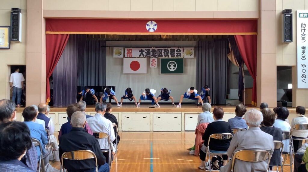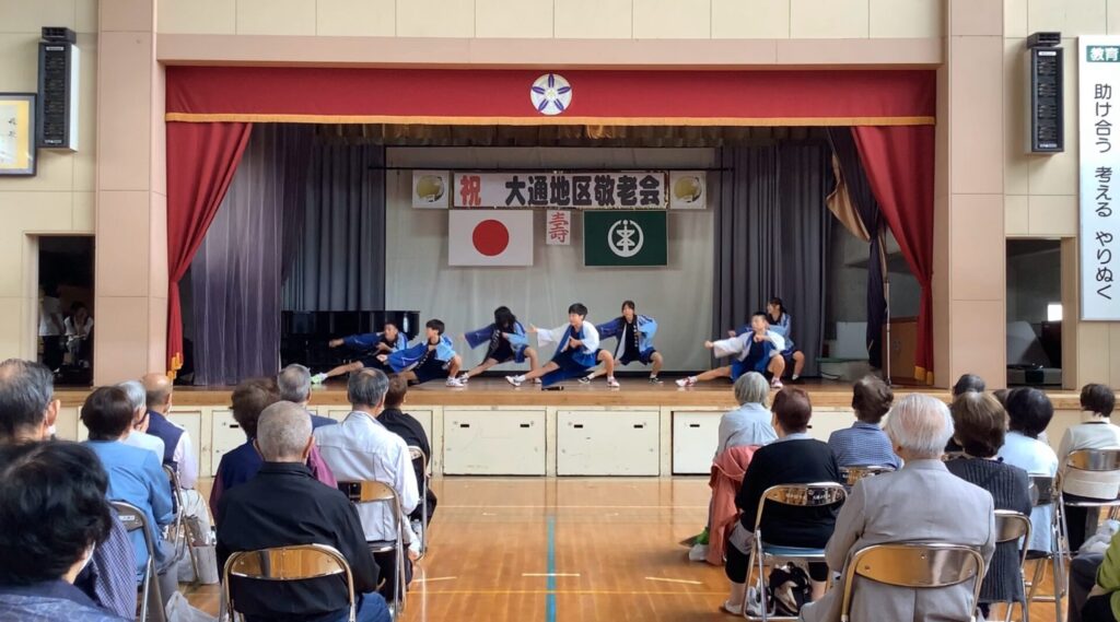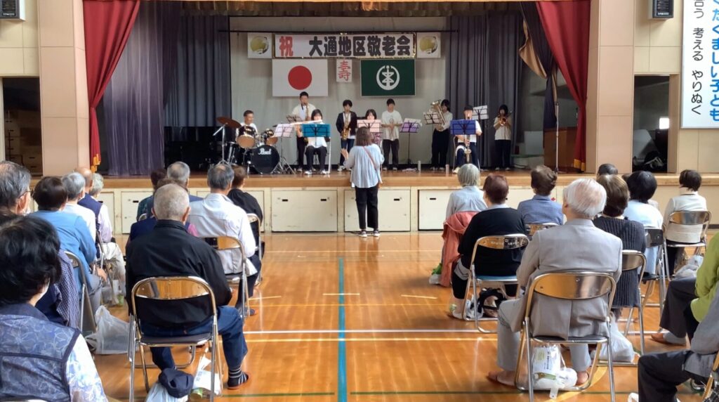 大通小学校で敬老会が開催されました。白根北中学校も参加し、吹奏楽部は演奏、生徒会本部は「白北よさこい」を披露しました。