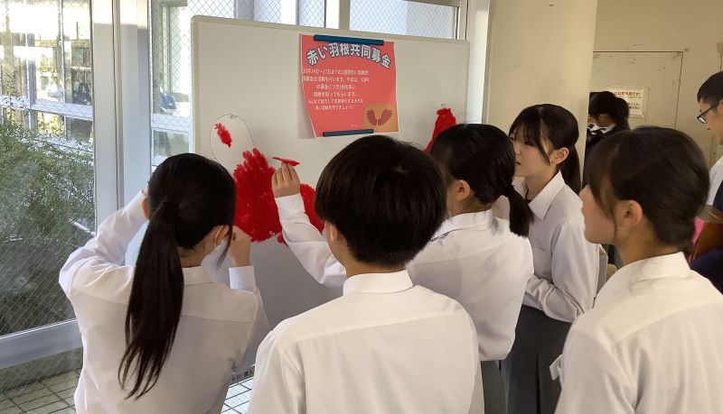 生徒会では毎朝、赤い羽根共同募金の活動を行っていました。