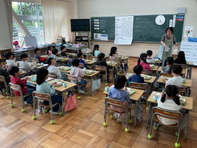 今日はいよいよ1年生の初給食です。出張から戻って急いで教室に行ったらちょうど準備が終わったところでした。 先生やボランティアさんにお聞きすると30分ほどで上手に準備ができたそうです。 長い針が …