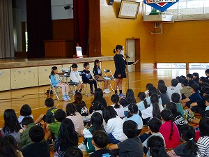 28日(火)に、4年生と6年生による「南区未来創造教室」発表会が行われました。南区長さんをはじめ、4年生の凧の学習や6年生の白根まち歩きの学習に関わっていただいた地域の方々においでいただき、学習を通して学んだことや、提言を発表しました。最後には、区長さんから、4年生は「白根大凧PR大使」6年生は、「白根のまち歩きPR大使」の証として大凧マンホールの缶バッチを今年も贈呈いただきました。